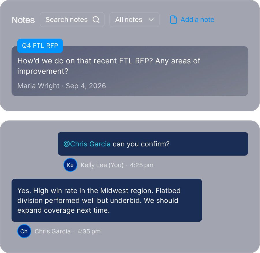 Collaborate directly on lanes, carriers, and customer accounts with full visibility into the data behind every decision.